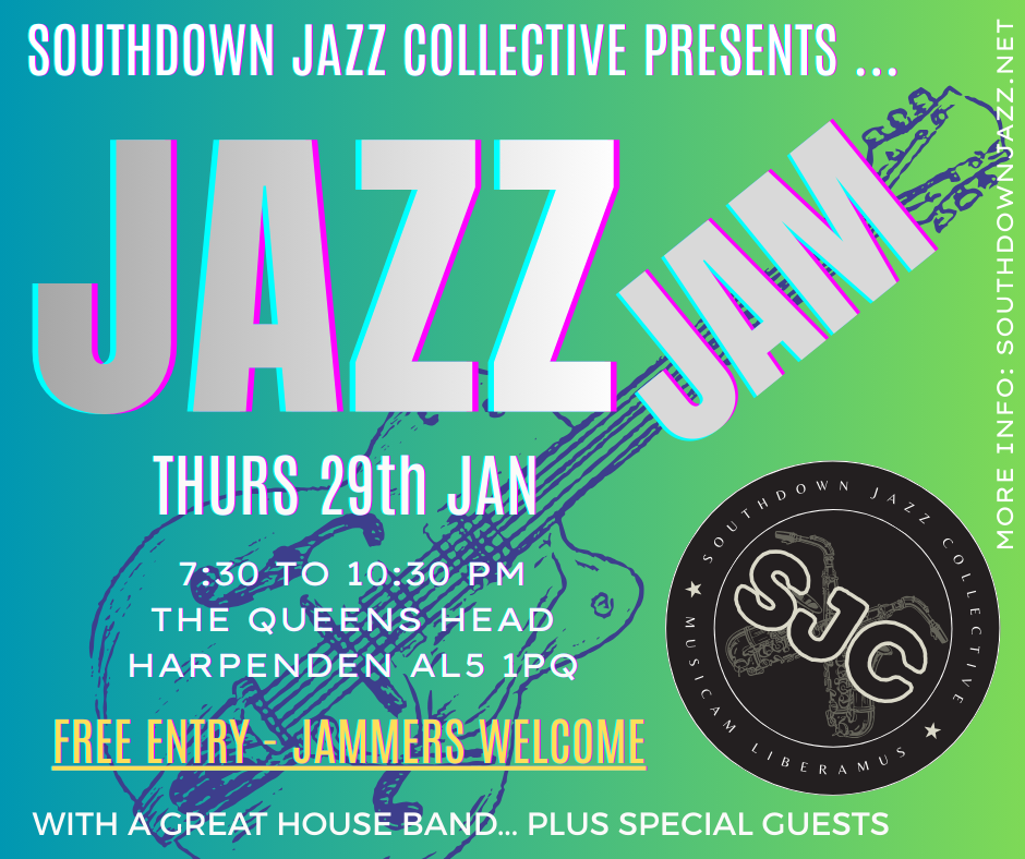 Our next jam will be on Thurs 25th May, 7:30pm till 10:30pm at The Queens Head. Please come and join us for a relaxed and fun evening of jazz, with house band Southdown Jazz Collective and lots of guest jammers.